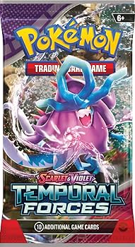 The ranks of Ancient and Future Pokémon continue to grow! Walking Wake ex breaks free of the past alongside Raging Bolt ex, while Iron Leaves ex delivers high-tech justice with Iron Crown ex. Outside Area Zero, Wugtrio and Farigiraf shift types as Tera Pokémon ex, and Pokémon Trainers everywhere prepare for the return of ACE SPEC cards with uniquely powerful effects. A rupture in time brings wild beasts and cyber visions to battle in the Pokémon TCG: Scarlet & Violet—Temporal Forces expansion!